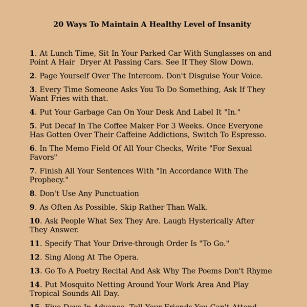 20 ways to keep a healthy level of sanity. When leaving the zoo, start running towards the parking lot, yelling run for your lives, they're loose!! 19. At lunch time, sit in your parked car w/ sunglasses on and point a > > > > hairdryer at passing cars.